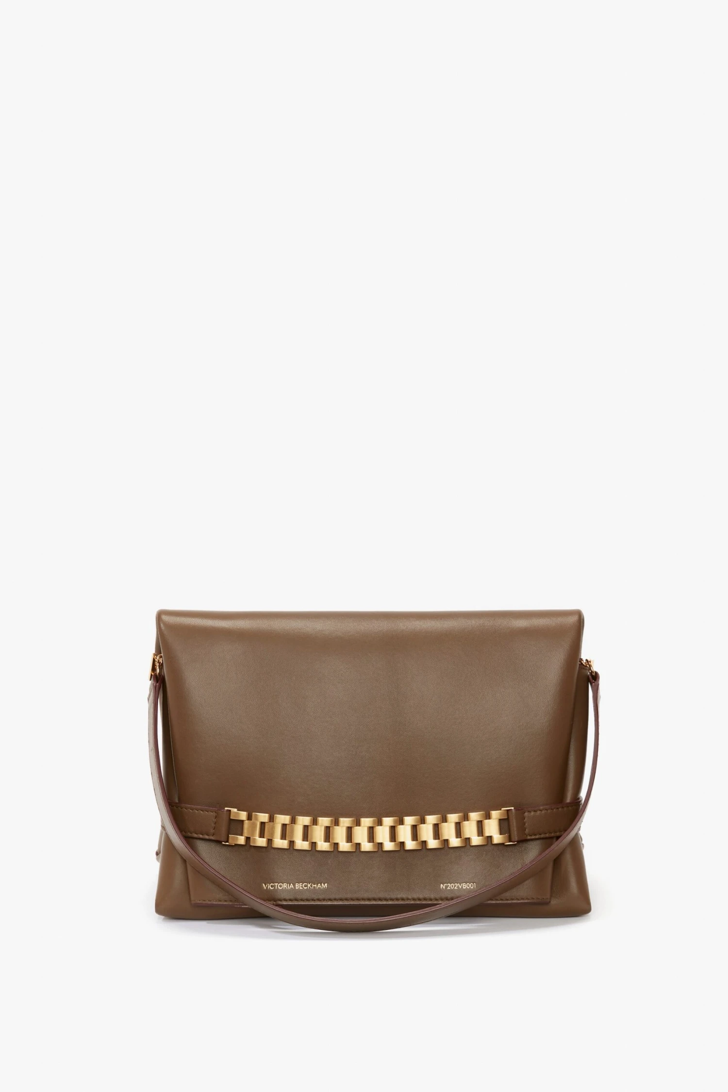 The utilitarian shade of khaki creates a cool contrast with the sophisticated gold hardware of the Chain Pouch bag. Crafted from the finest Nappa leather, it is generously sized with a chic envelope design. Features include a middle zip compartment and a detachable strap for versatile styling.
