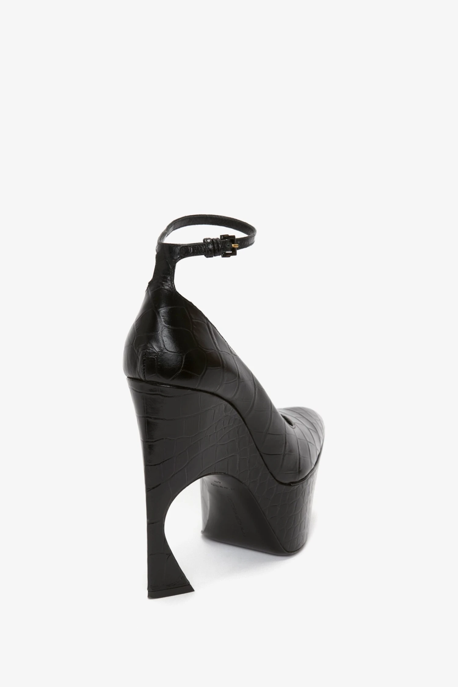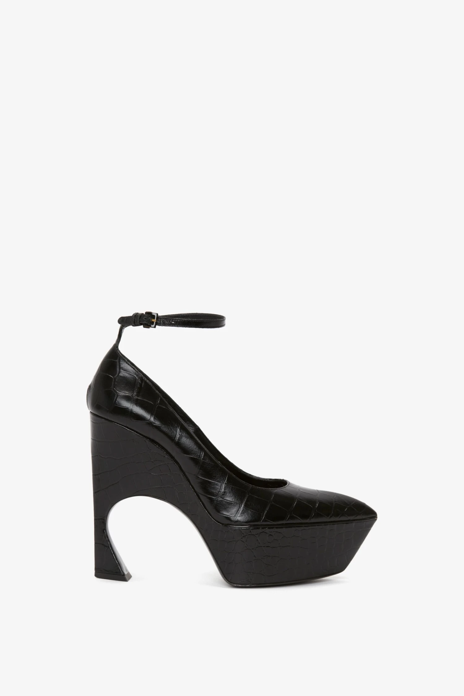 A directional design for the new season, these sculptural pumps in an embossed croc leather finish have a curved heel that is both feminine and futuristic. A key silhouette in the AW23 footwear edit and one of Victoria’s favourite styles, they have a wedge sole that provides height, but also comfort and stability. The ankle strap is adjustable, and the pointed toe design adds a contemporary finish.