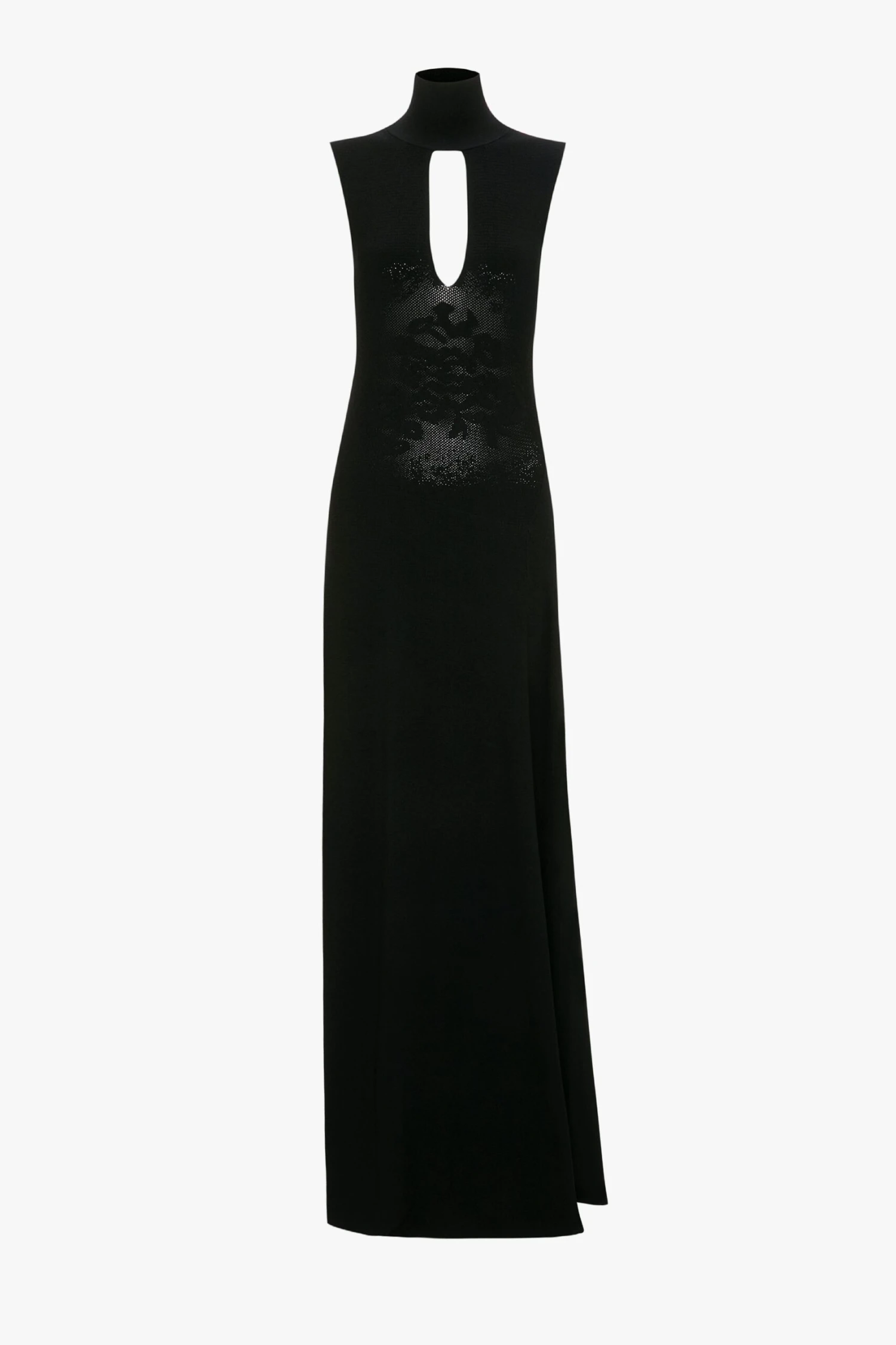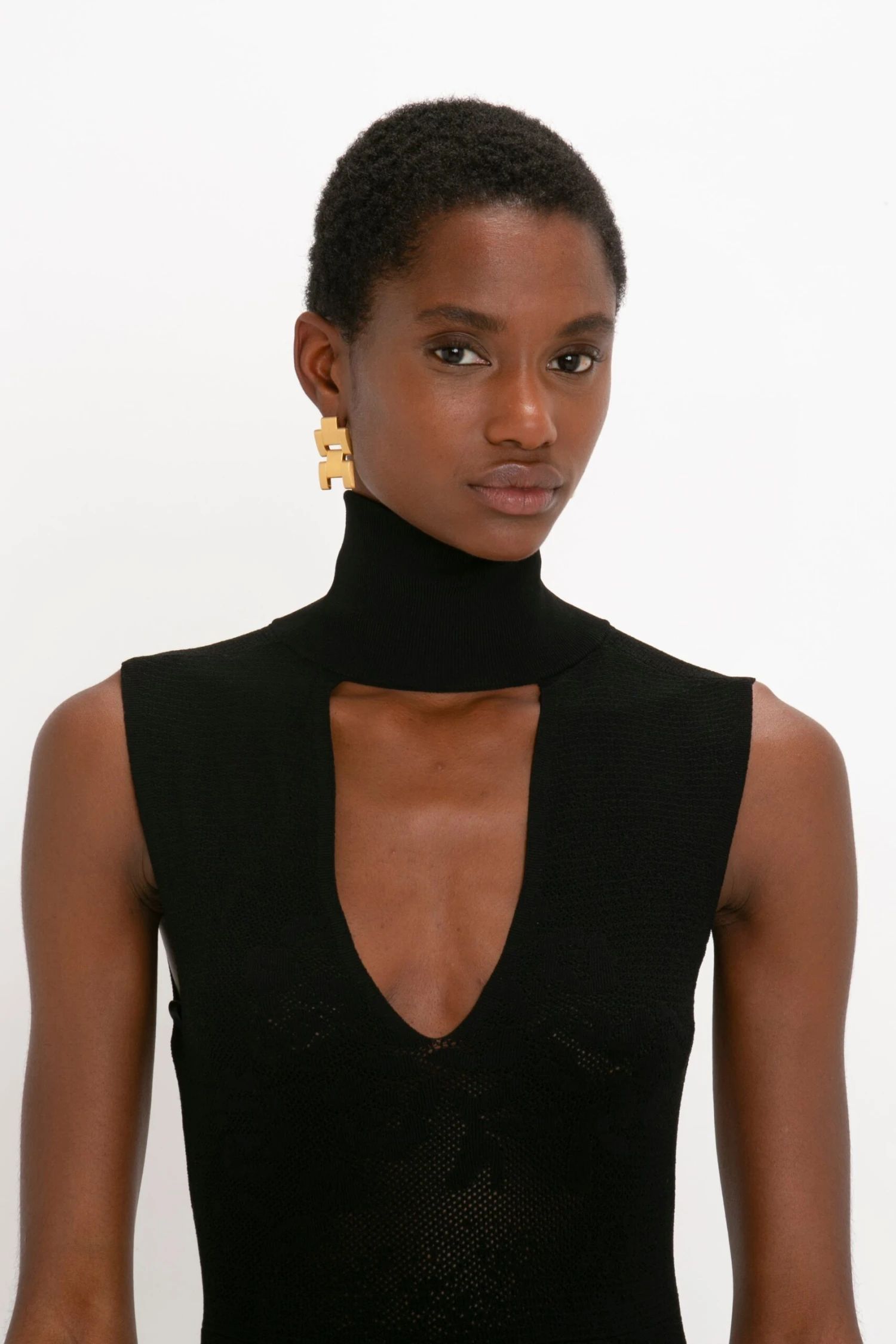 A high polo neck and plunging cut-out V-neck imbue a classic black dress with fresh energy. Crafted from a lightweight viscose knit with pointelle detailing, it skims and shapes the upper body before falling from the hips into a subtle A-line silhouette. A dramatic deep V at the back provides a provocative and playful finishing touch.