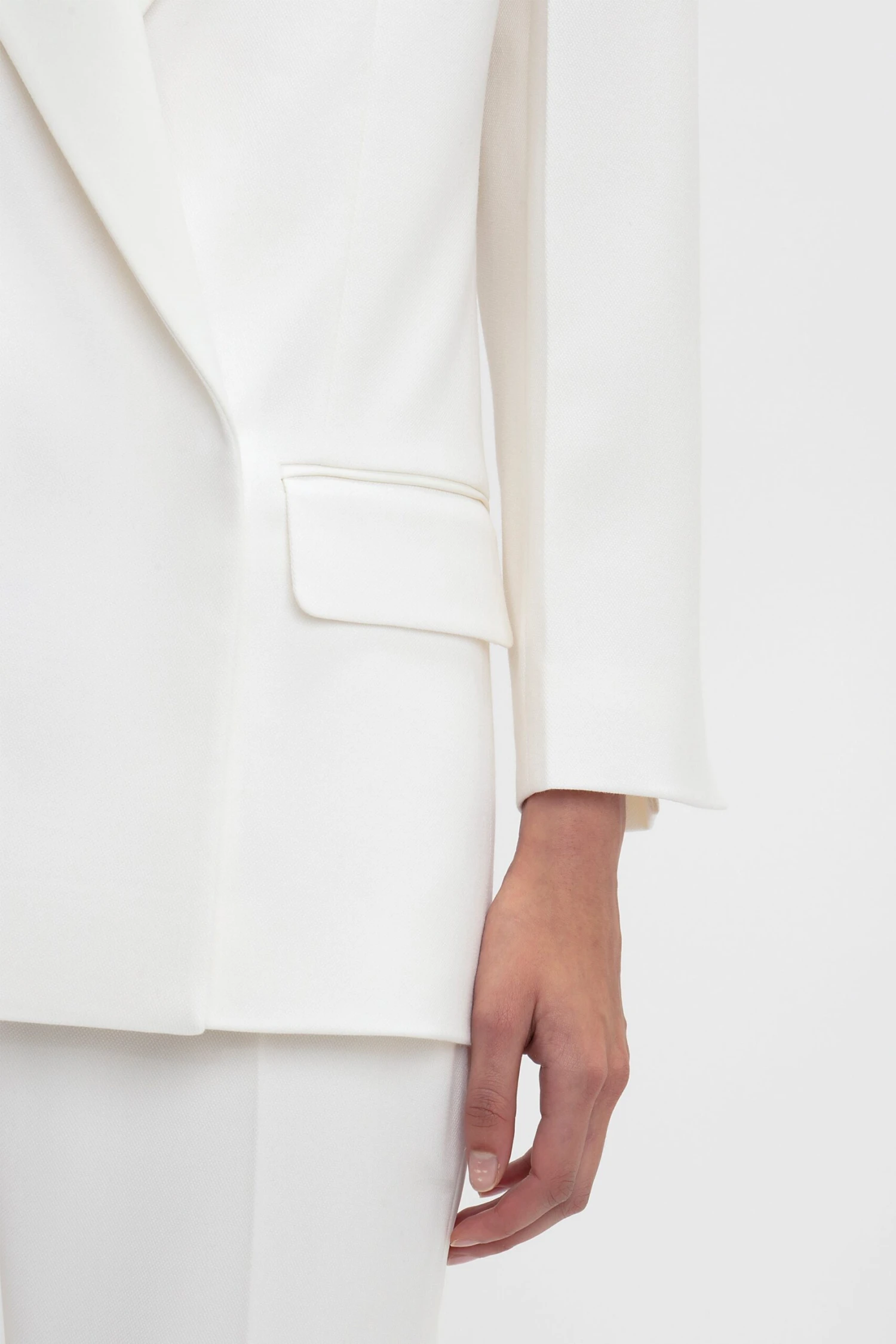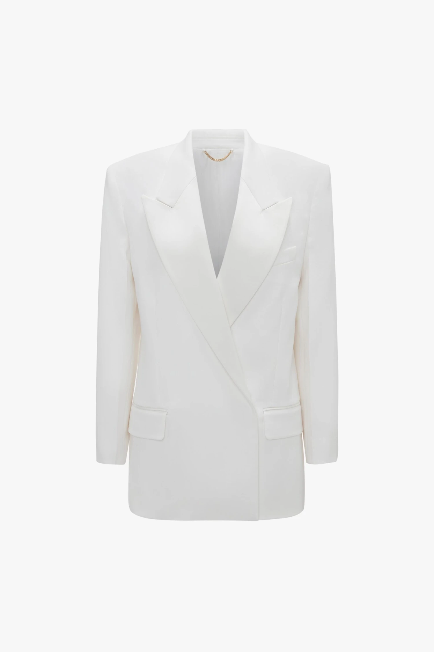 Expertly tailored for a loose fit and ‘70s feel, this wool-blend suit jacket embodies the glamour of black-tie occasions. Designed in classic tuxedo style, it’s cut in a boxy silhouette with structured shoulders, satin peak lapels, pocket trims, and four-button cuffs.