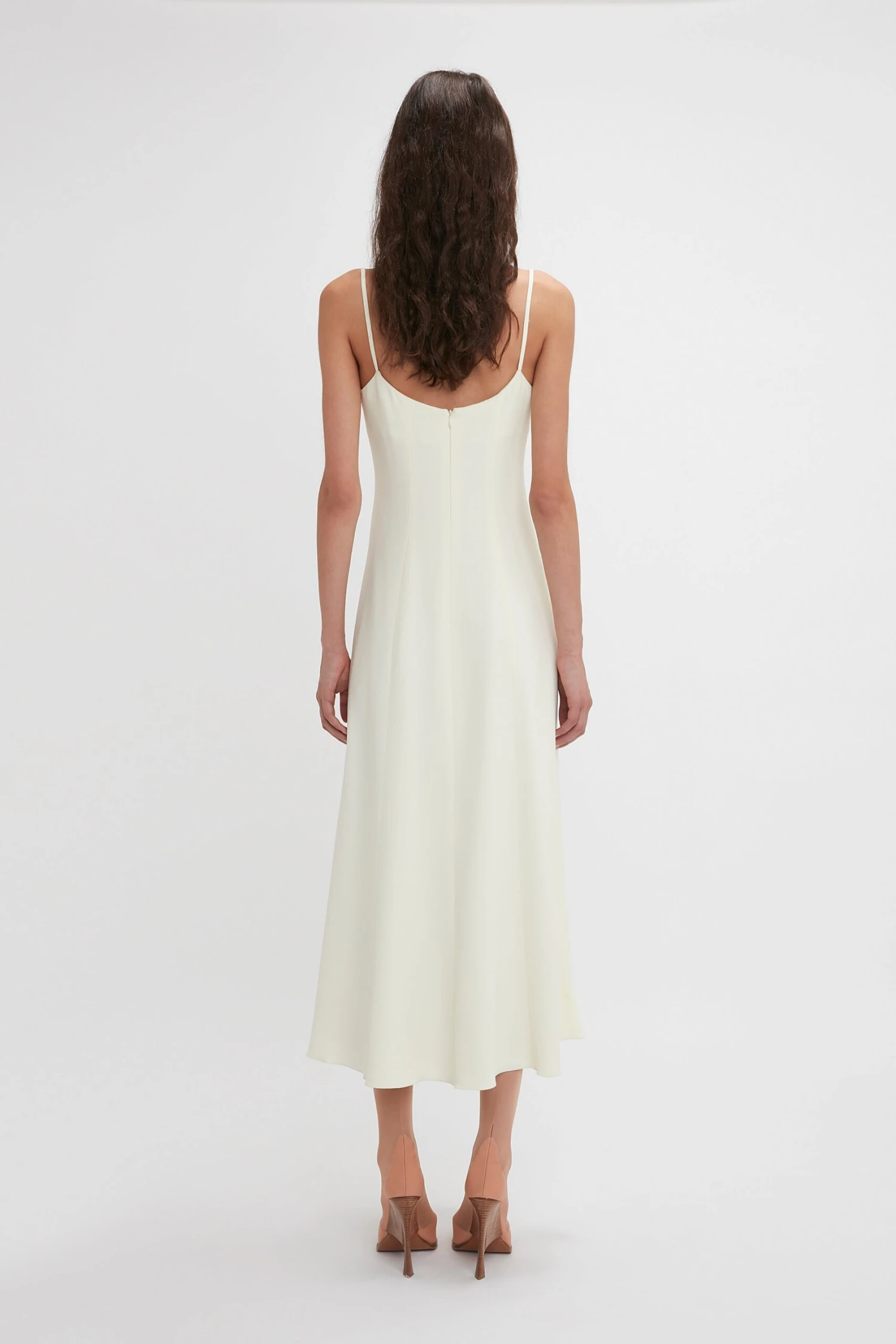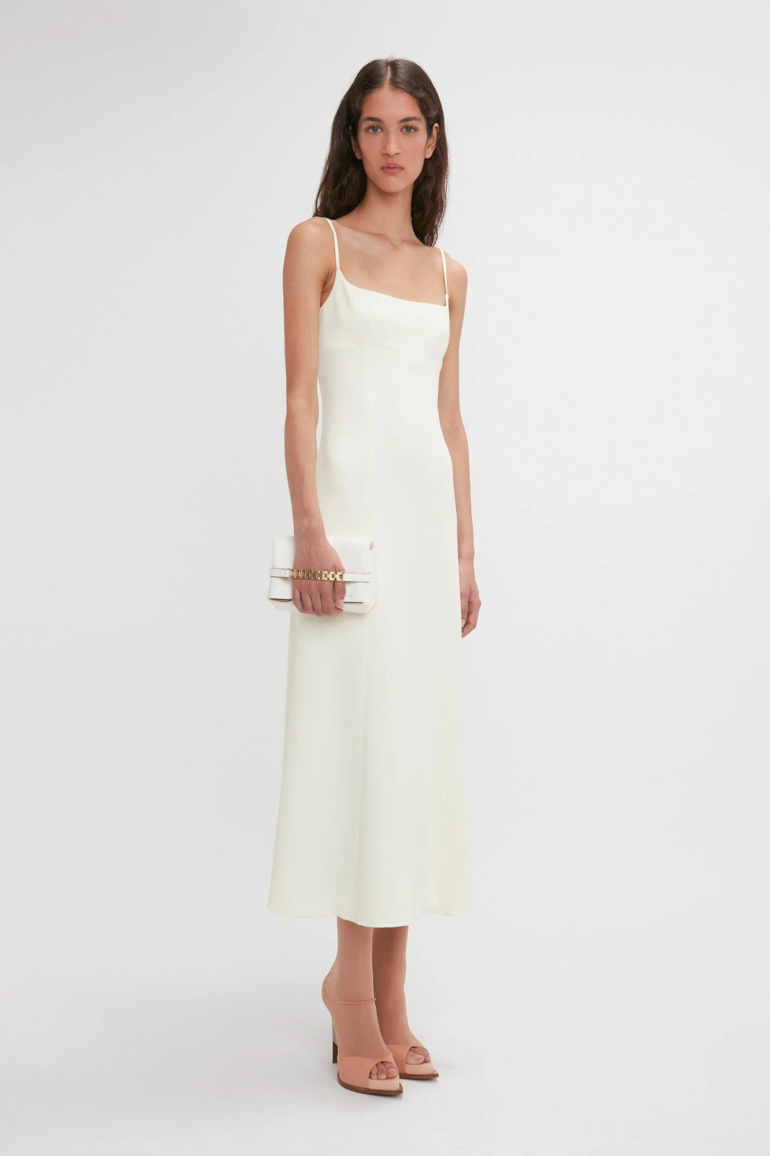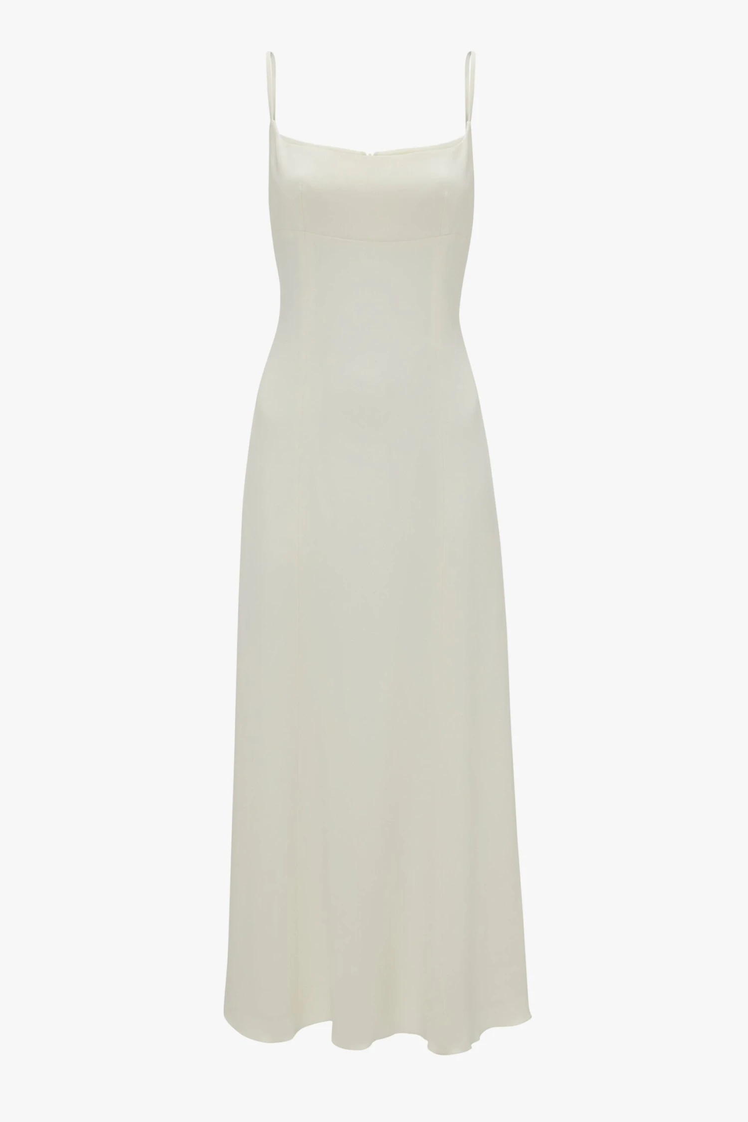 The camisole and slip dress were staples in the ’90s, one of Victoria Beckham’s favourite decades. Made from fluid crepe in a fresh ivory hue, this midi dress features a square neckline and dainty, adjustable straps. A day-to-night classic reimagined by Victoria’s daughter Harper; the vertical panelling lengthens and sculpts the silhouette.