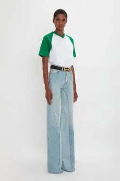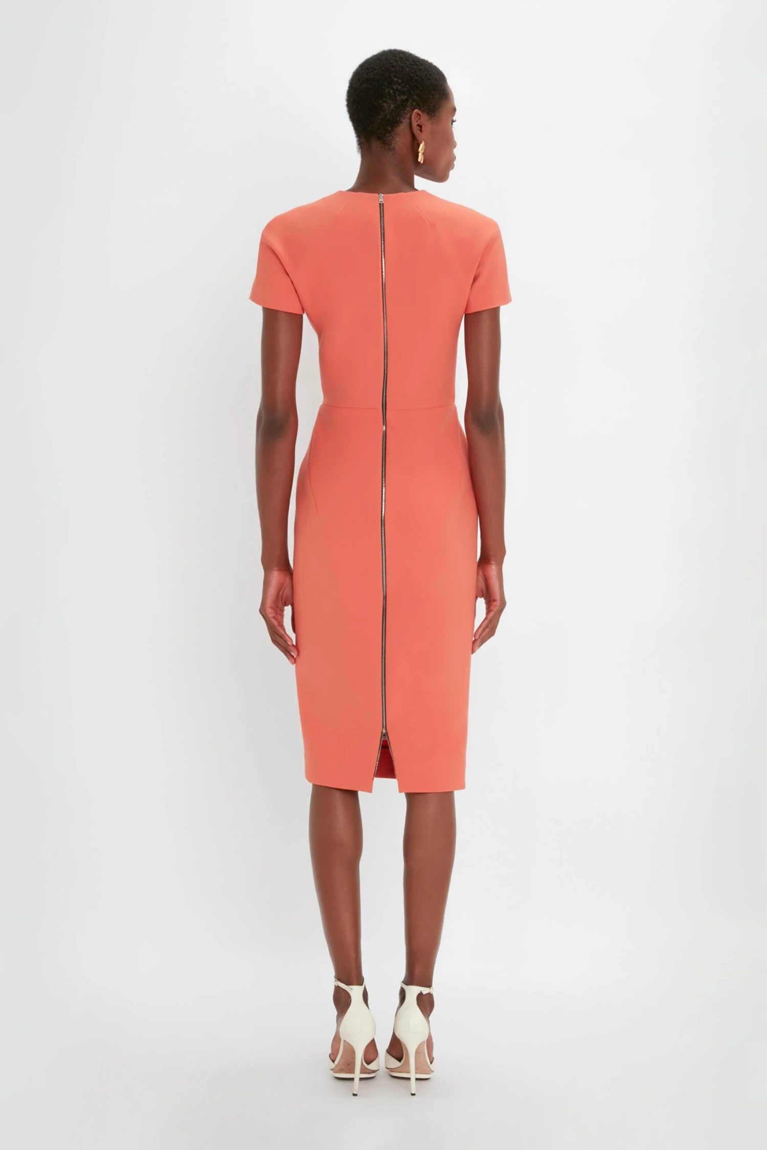 With a modest round neckline, short sleeves and a midi-length hem, the Victoria Beckham signature T-shirt dress has an understated sophistication. Dart details create a defined waistline, while double-ended exposed metal zips to the back add a contemporary design feature. Presented in striking Papaya for the new season, it’s a wear-anywhere wardrobe staple.