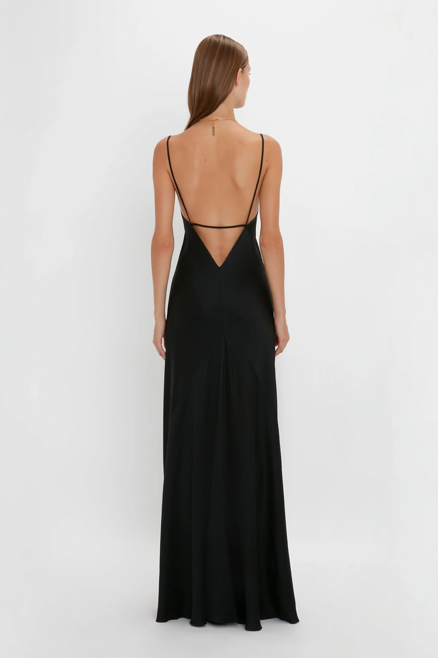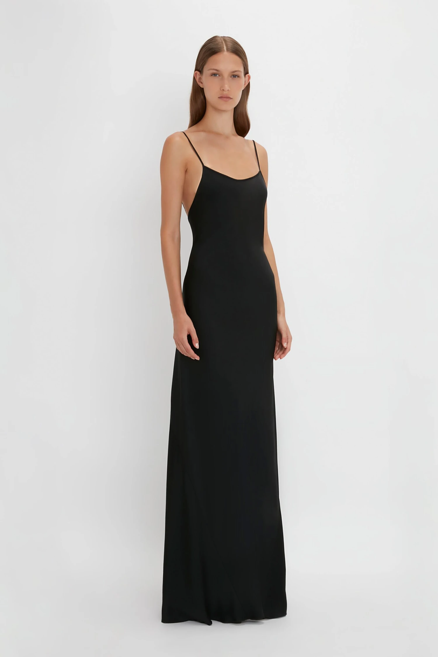 The camisole and slip dress were staples in the 90s, one of Victoria’s favourite decades. Made from fluid, crepe back satin, it features a deep V and strap detail on the back that adds to its open, light feeling. In classic black, it’s an effortless piece for any occasion.