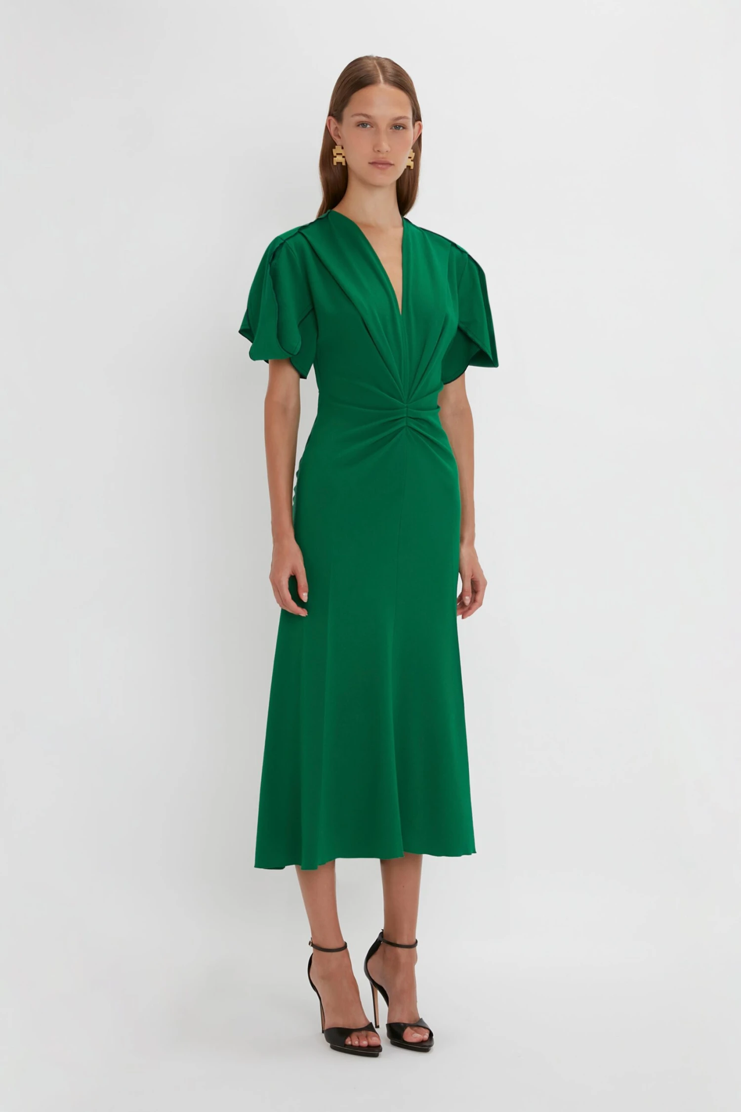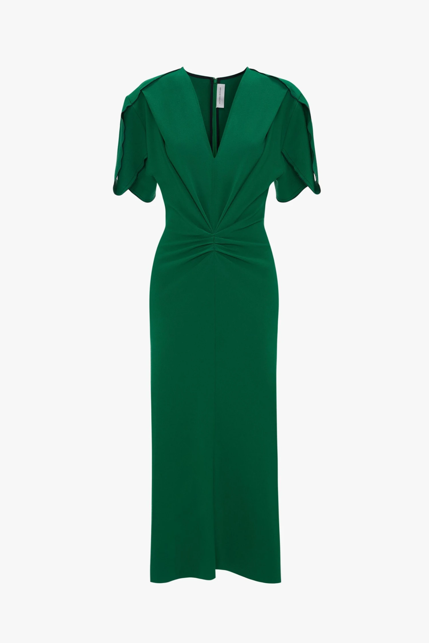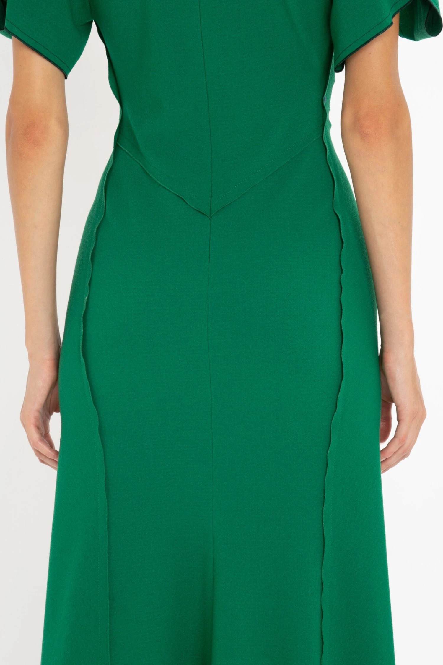 Crafted in a figure-flattering stretch fabric, this V-neck dress has a soft curved neckline and waist-defining pleat detail. Structured short sleeves with exposed seams add a contemporary talking point, while a longer-length hem to the back brings a feminine flourish to this wear-anywhere piece.