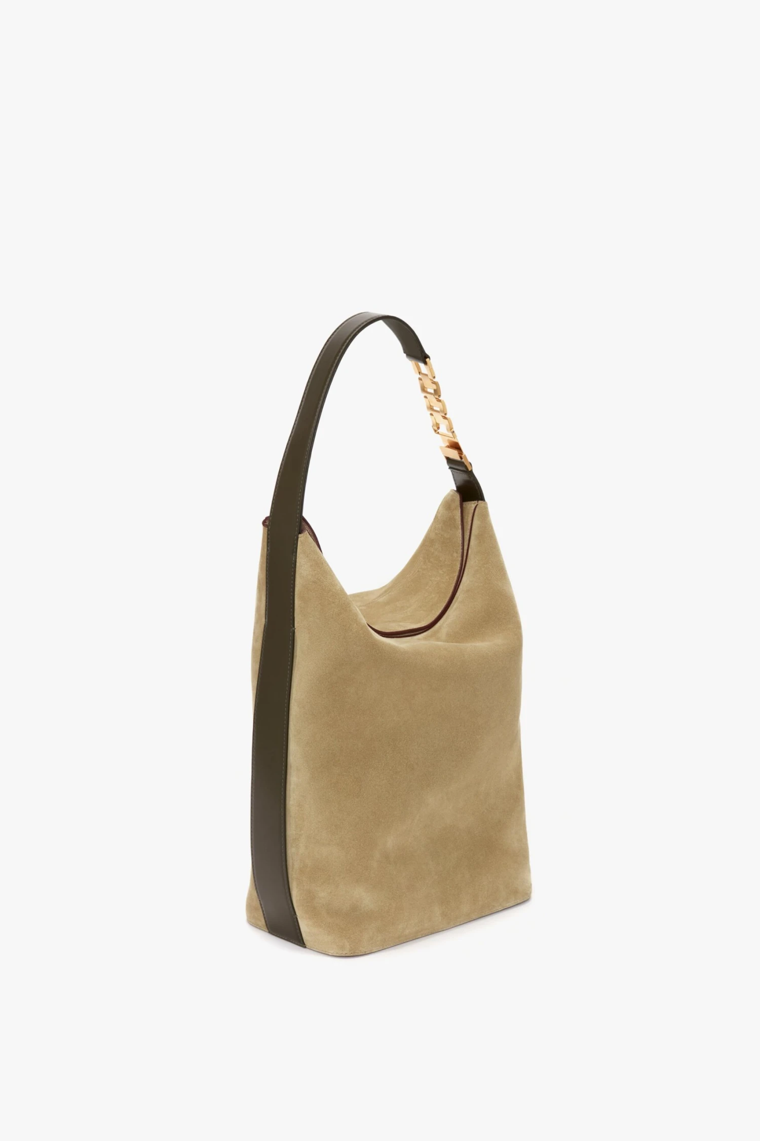 Tactile suede and Italian leather are crafted into a sophisticated large hold-all with a firm base for a smart, structured appearance. Features include a secure magnetic closure, accessible inside pocket and contrasting black strap with gold-tone chain detail.