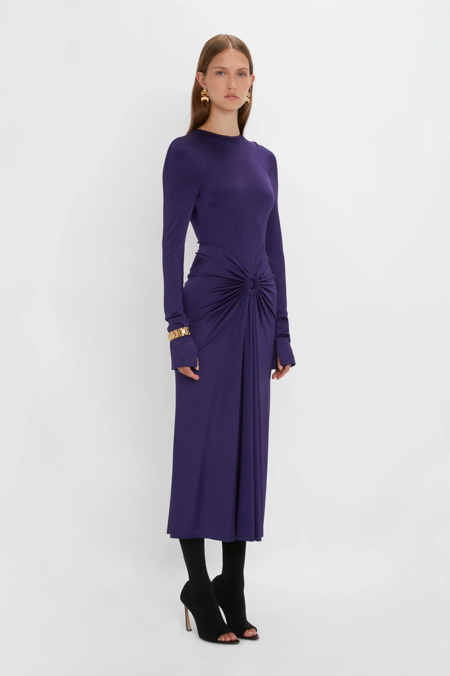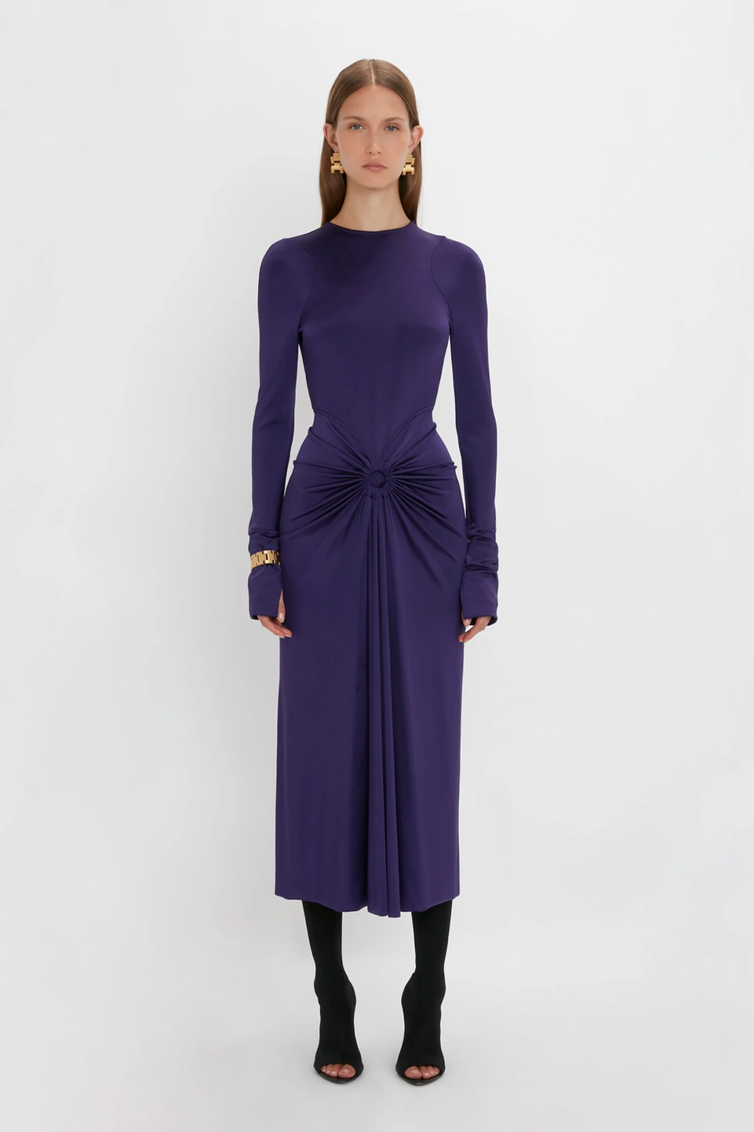 The body-sculpting stretch fabric of this Gathered Midi Dress creates a streamlined and confident silhouette. A circular gathered detail at the front of the skirt and gathered effect at the back soften the aesthetic, bringing a tactility that is both sensuous and playful.
