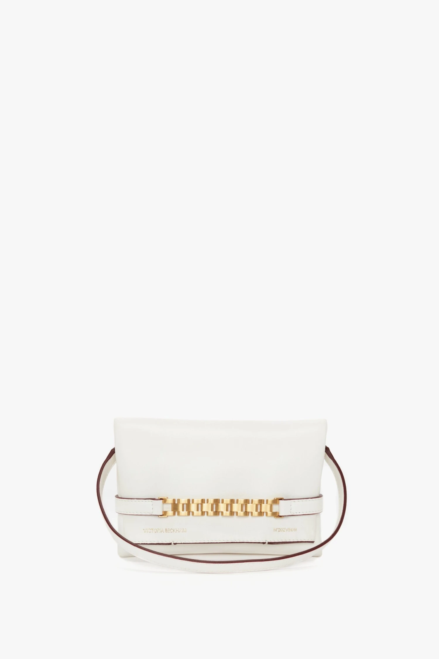 A miniature version of the Chain Pouch, the Mini Pouch is crafted in Nappa leather for a buttersoft, tactile quality. Designed in crisp white, features include a detachable strap for versatility and two internal compartments with leather divide.