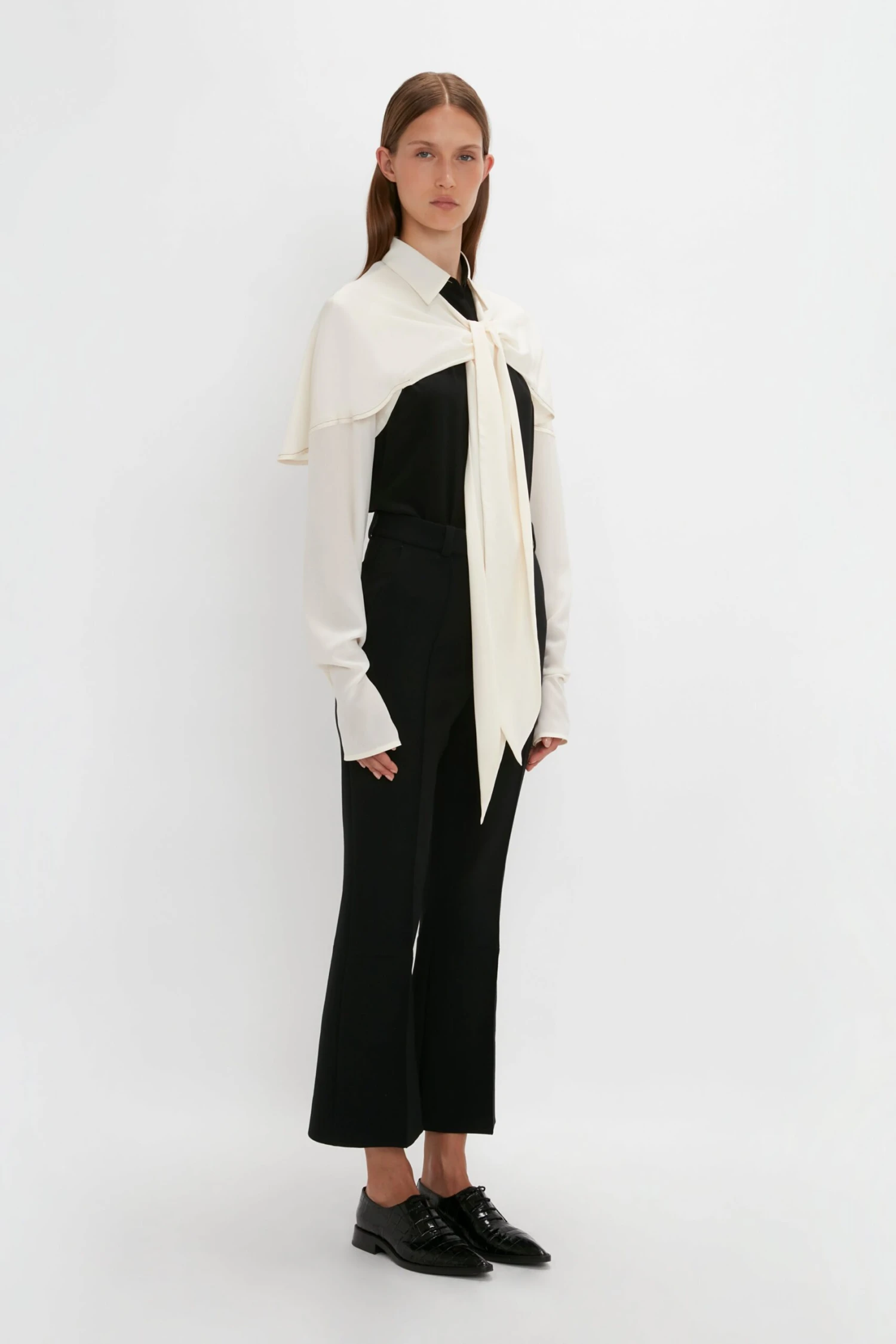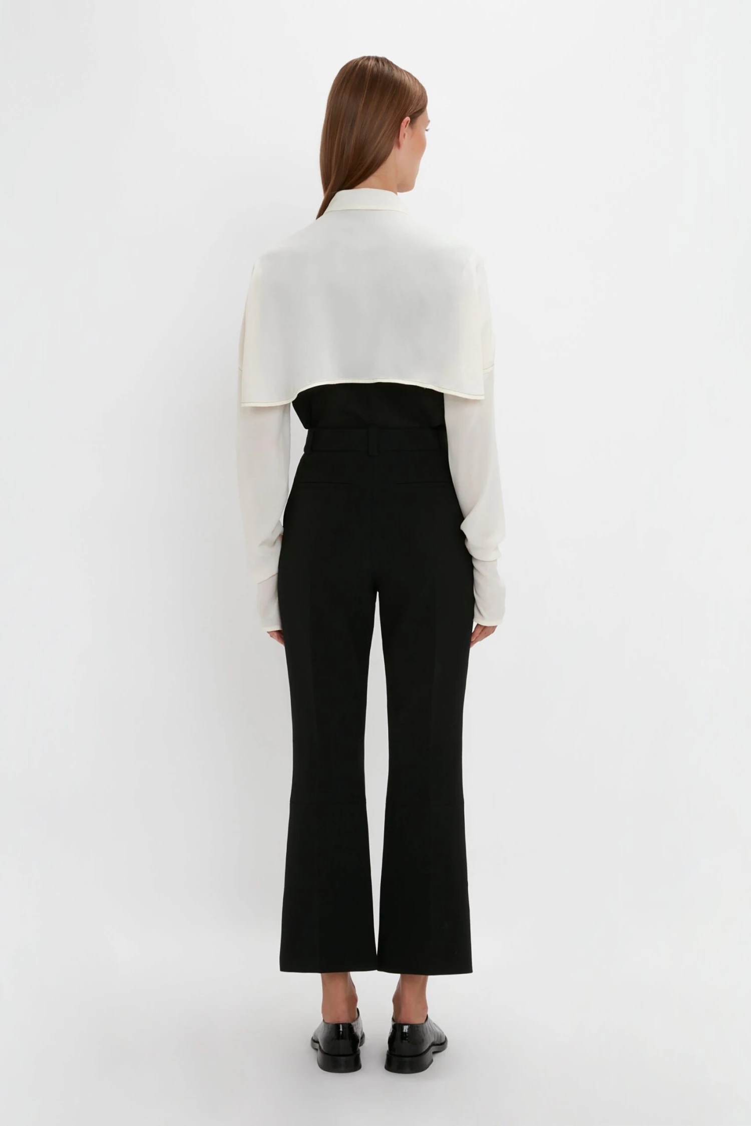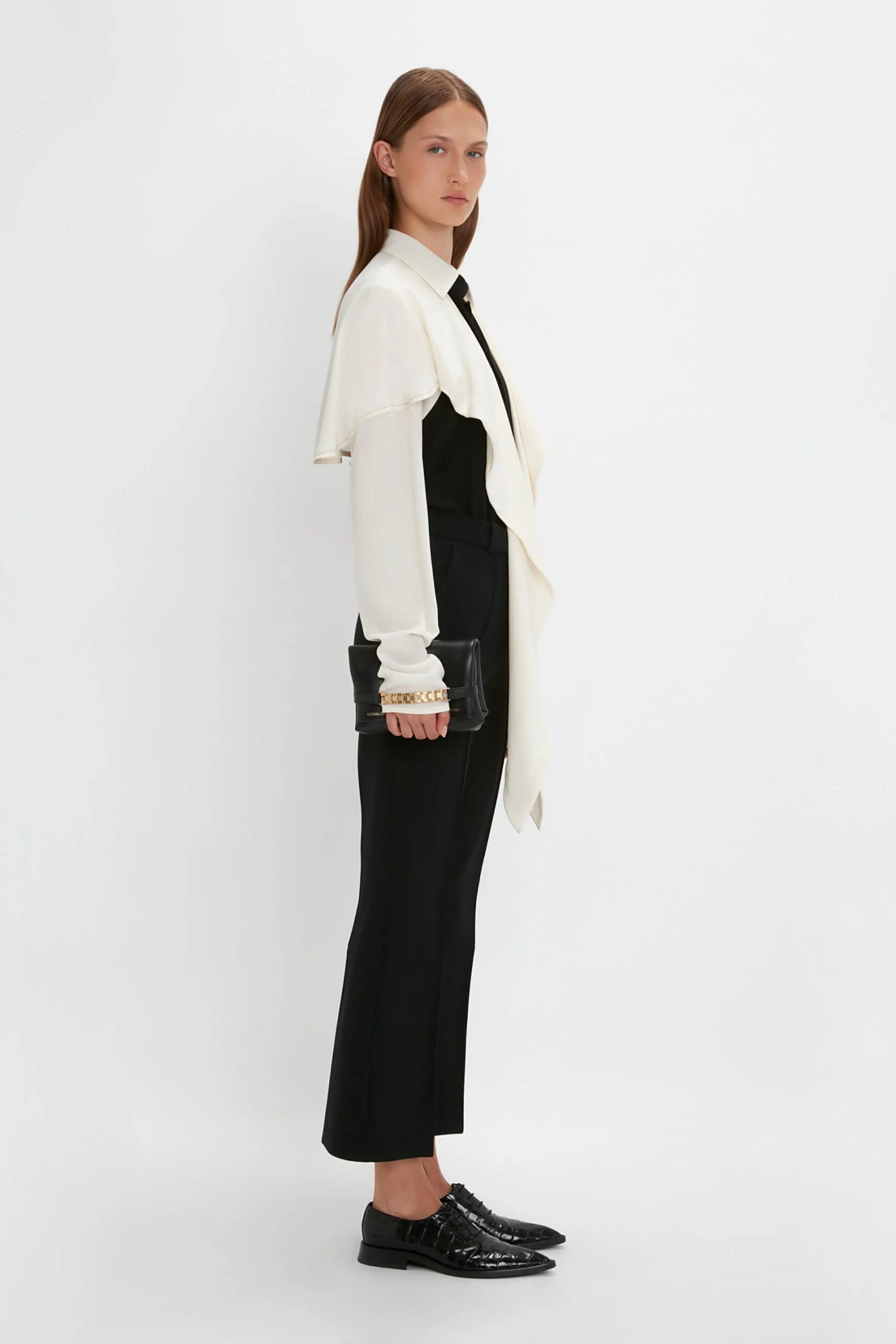 Styled with the Cropped Kick Trouser, Mini Chain Pouch and the Pointy Toe Flat Lace Up