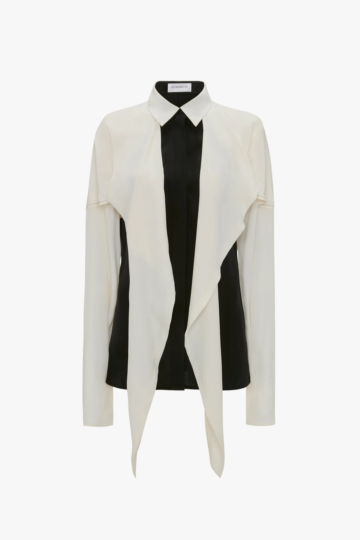 The Oversized Bow Detail Blouse sees masculine shirting injected with a feminine flourish. A cape-style drape at the back ties into an exaggerated bow at the front. Left untied, it creates a dramatic, elongating detail. The blouse also has a traditional button-front closure and longer-length sleeves for a dramatic finishing touch.