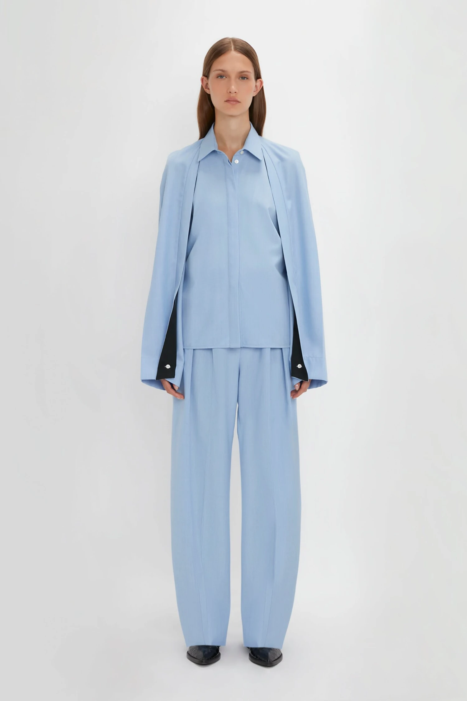 Styled with the Gathered Waist Utility Trouser and the Pointy Toe Flat Lace Up
