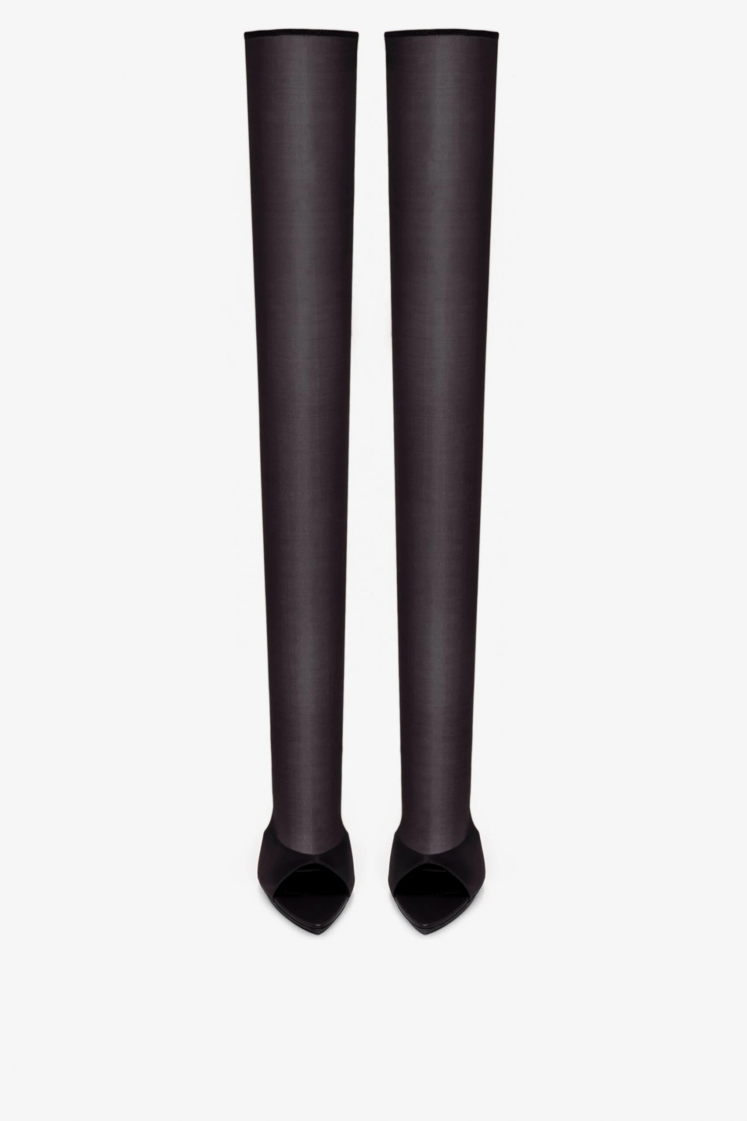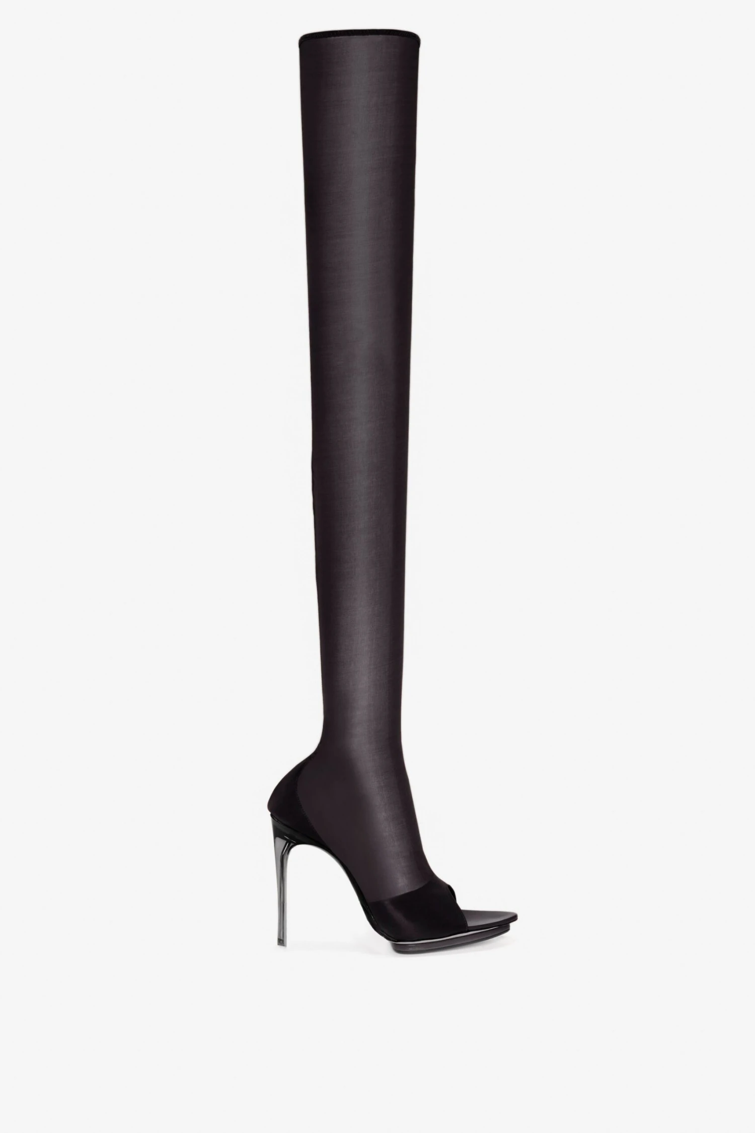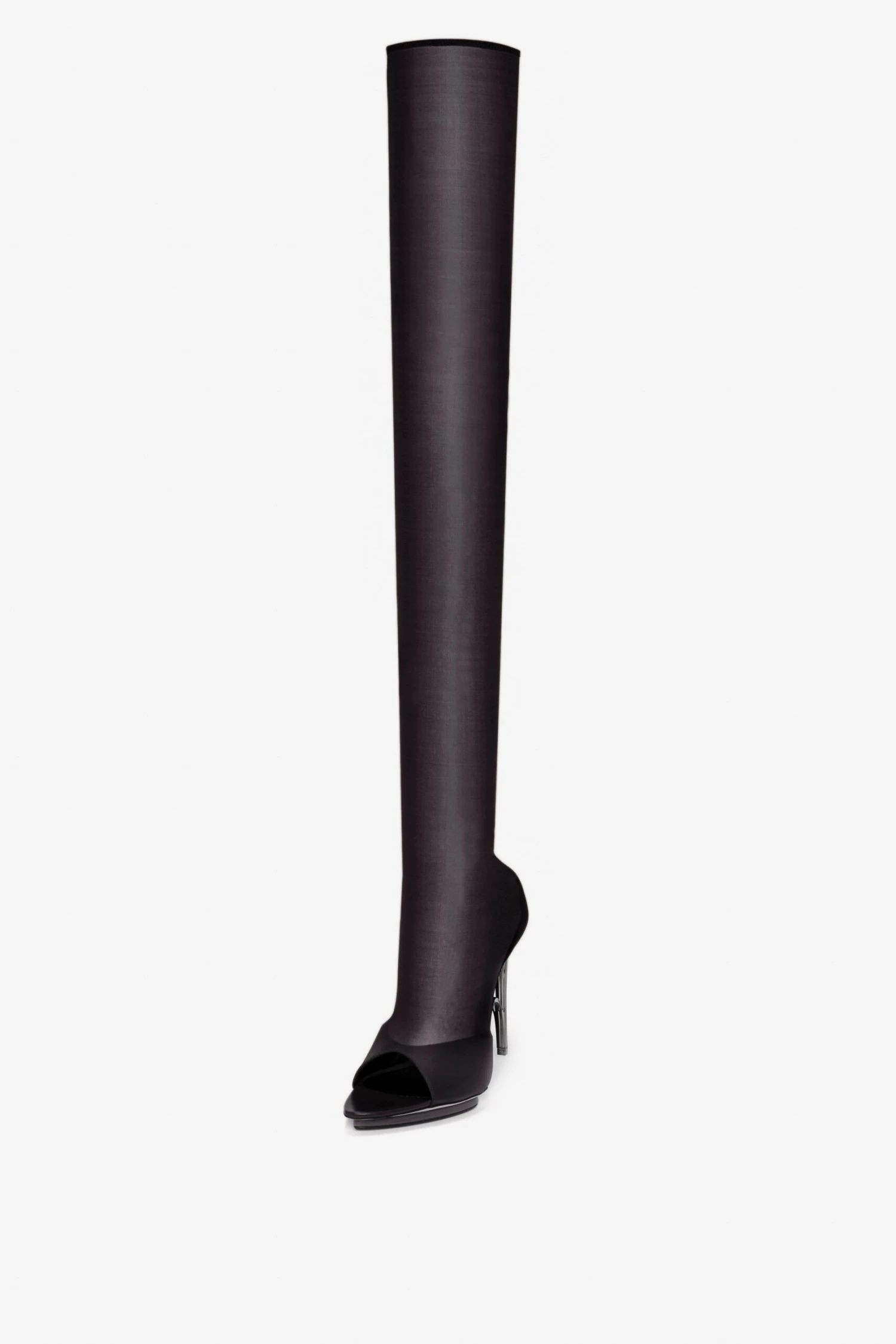 A provocative thigh-high sandal boot is given a playful twist with a peep toe and backseam detail. The mesh fabric leg and leather shoe create a modern, textured contrast.