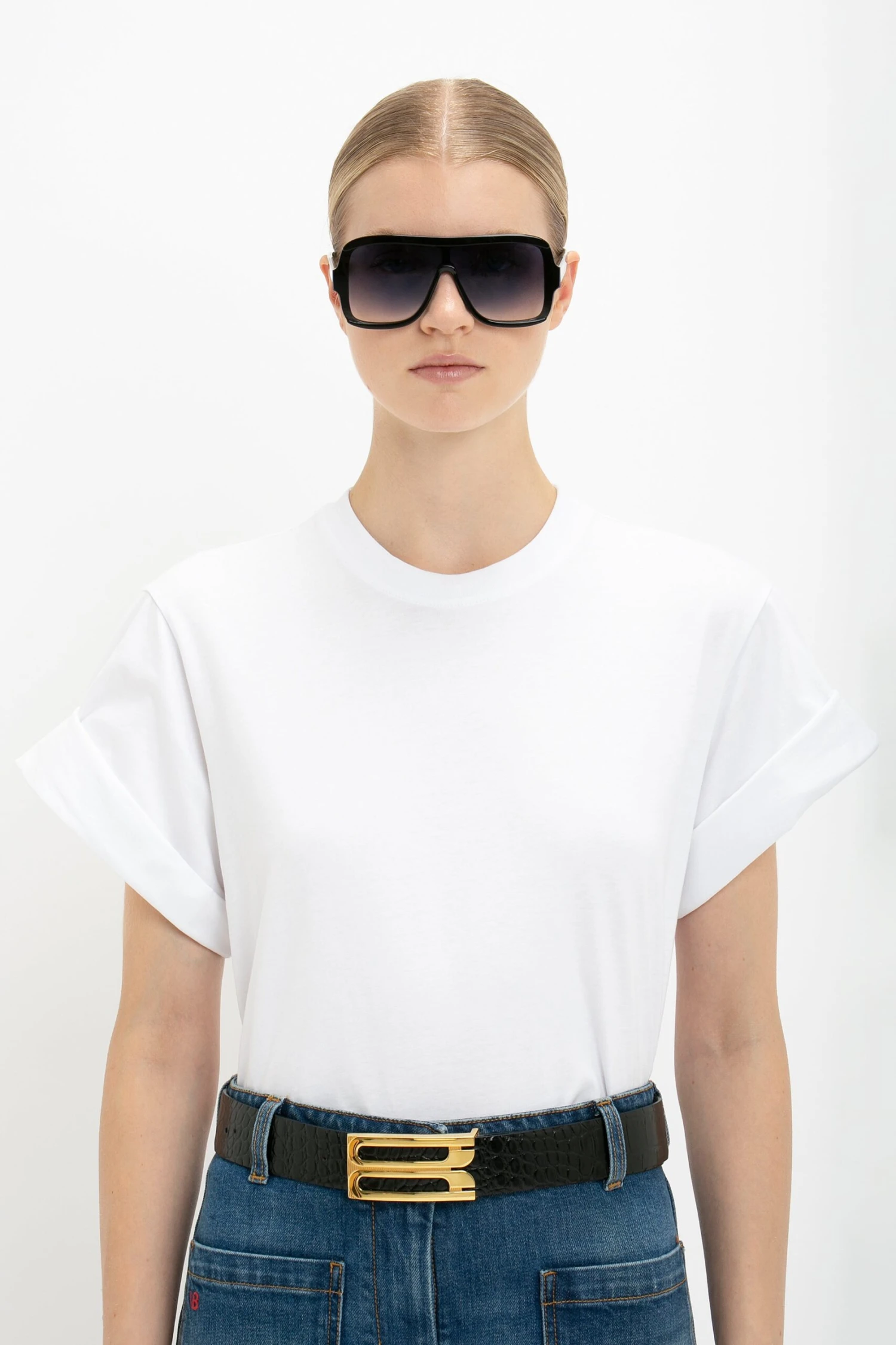 Styled with the Alina Jean In Dark Vintage Wash, Jumbo Frame Belt and Chain Pouch With Strap In Croc Leather, Layered Mask In Black Gradient Sunglasses and the Pointed Toe Stiletto Sandals In Black