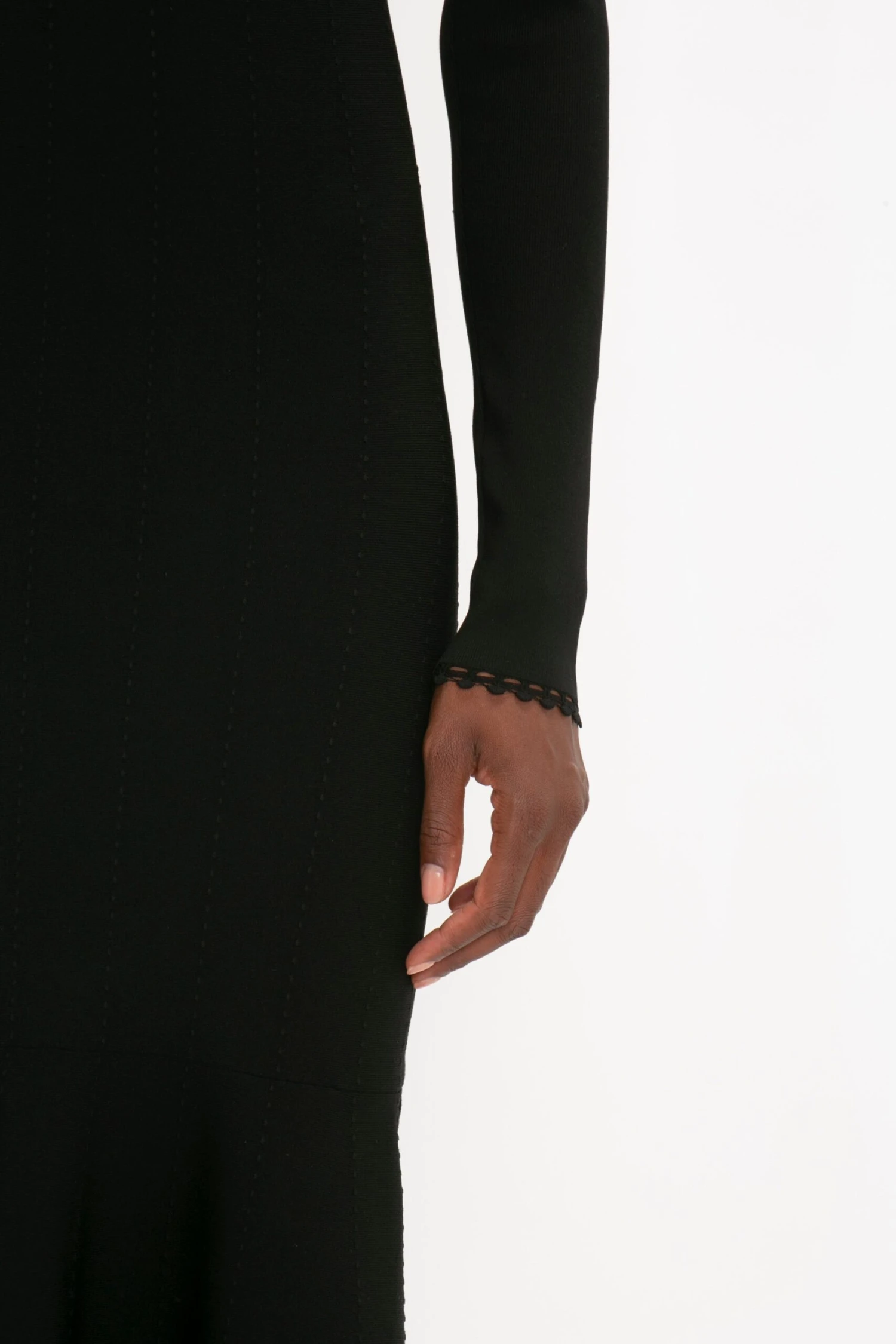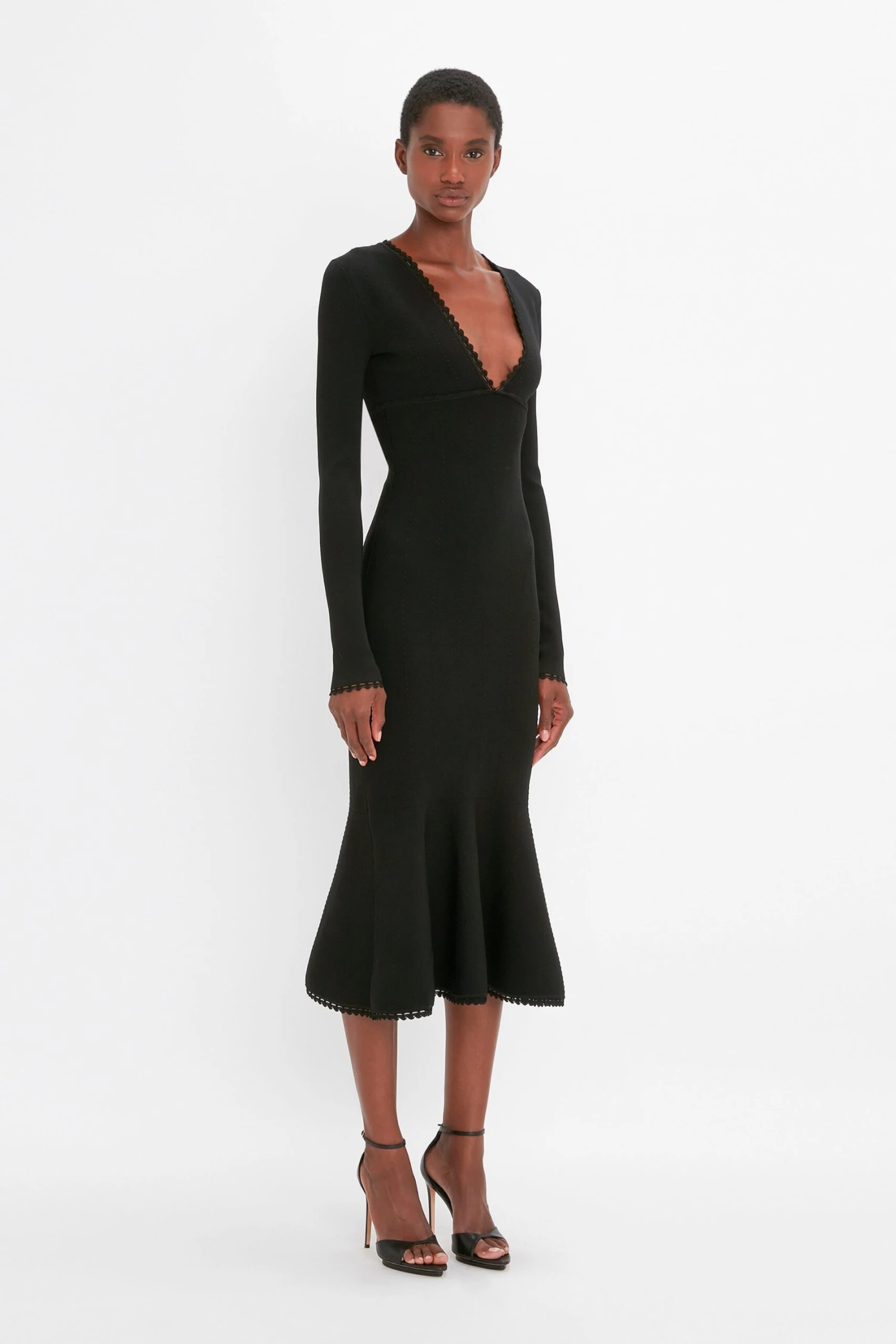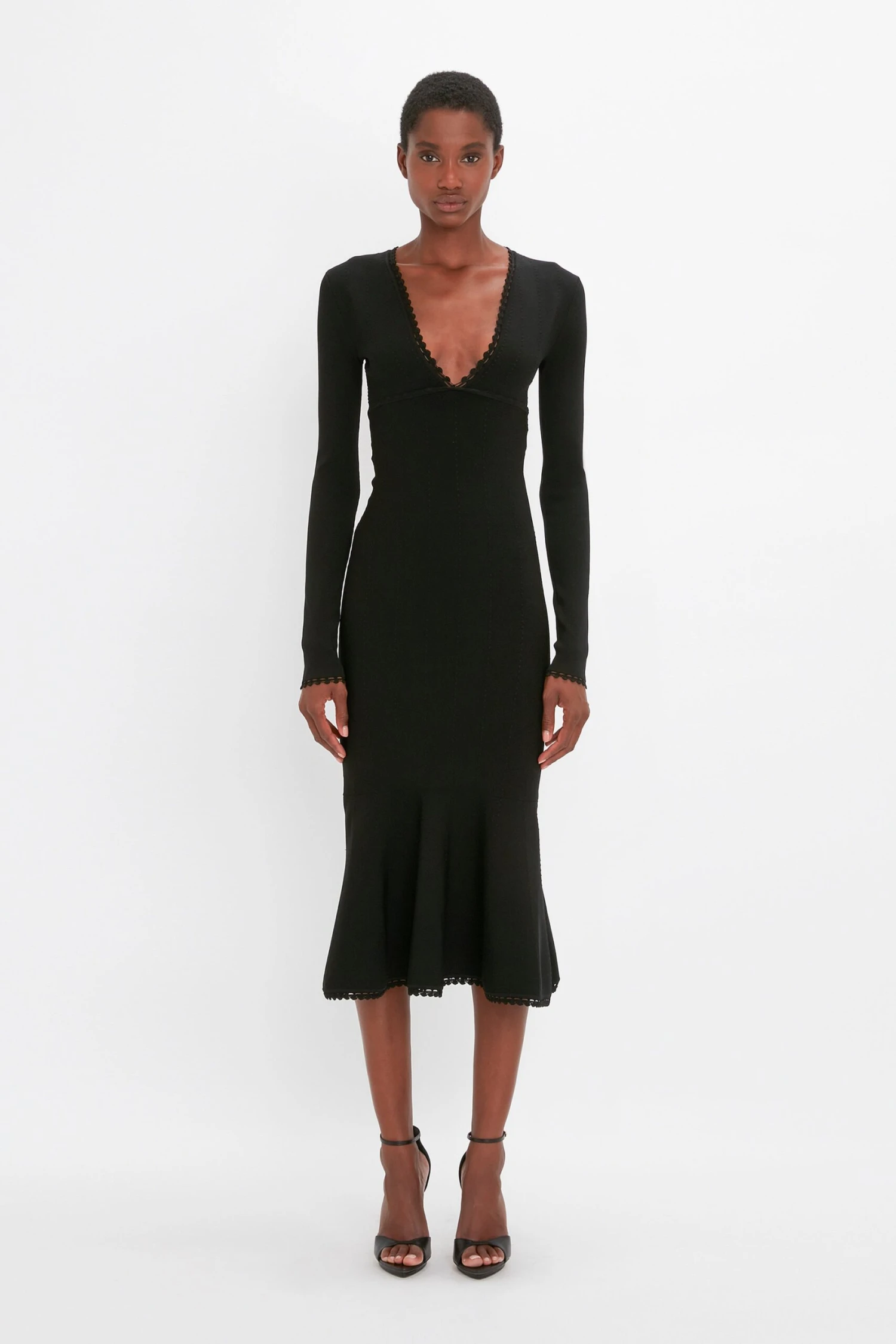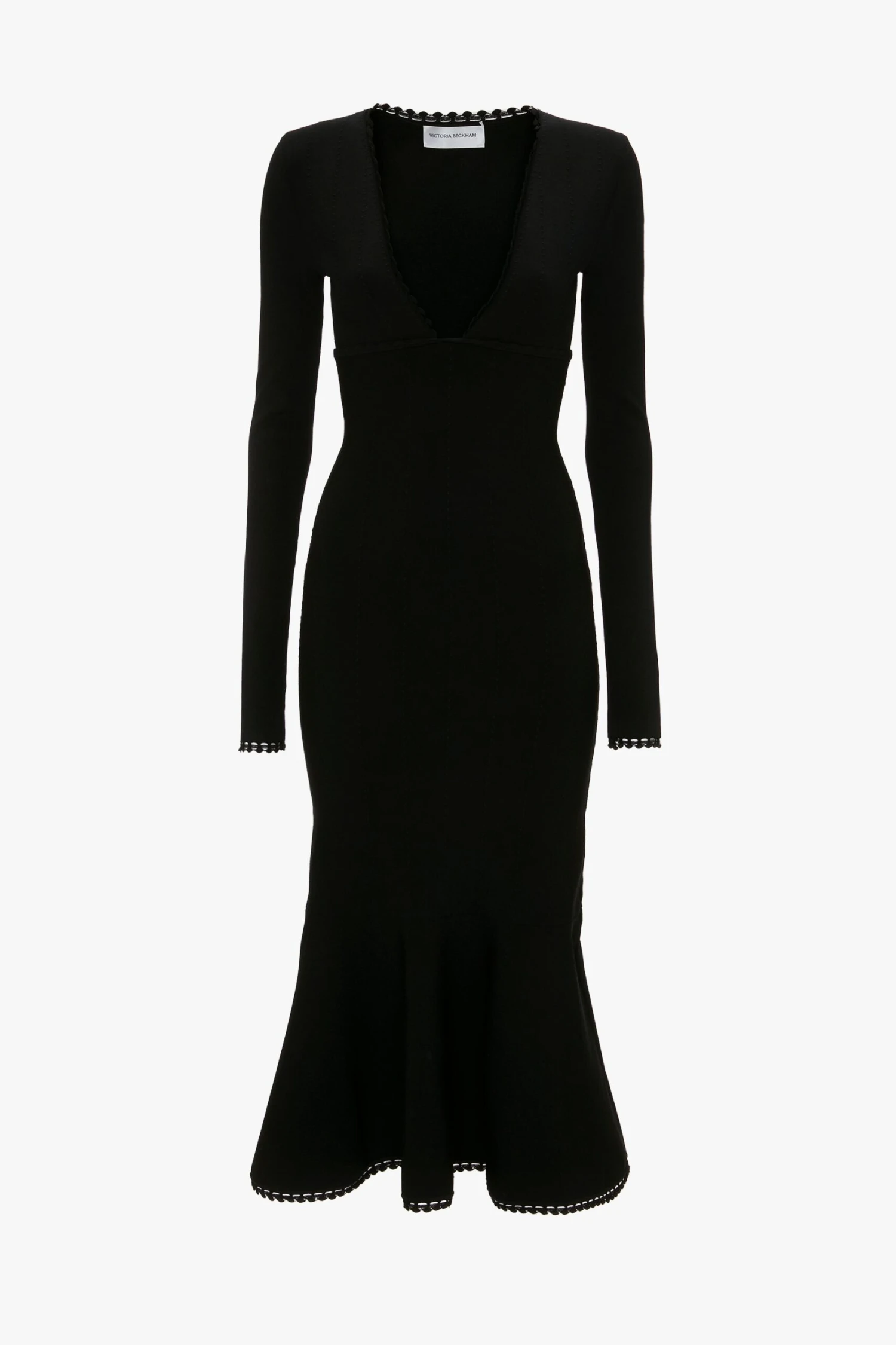 This body-sculpting fit-and-flare dress with plunging V-neck is both provocative and polished. Expertly crafted from an exclusive, tightly woven compact knit for comfort and fit, it has a modest midi-length hemline and long sleeves. A scallop-edged neckline, cuffs and hemline add a feminine delicacy to this confident silhouette.