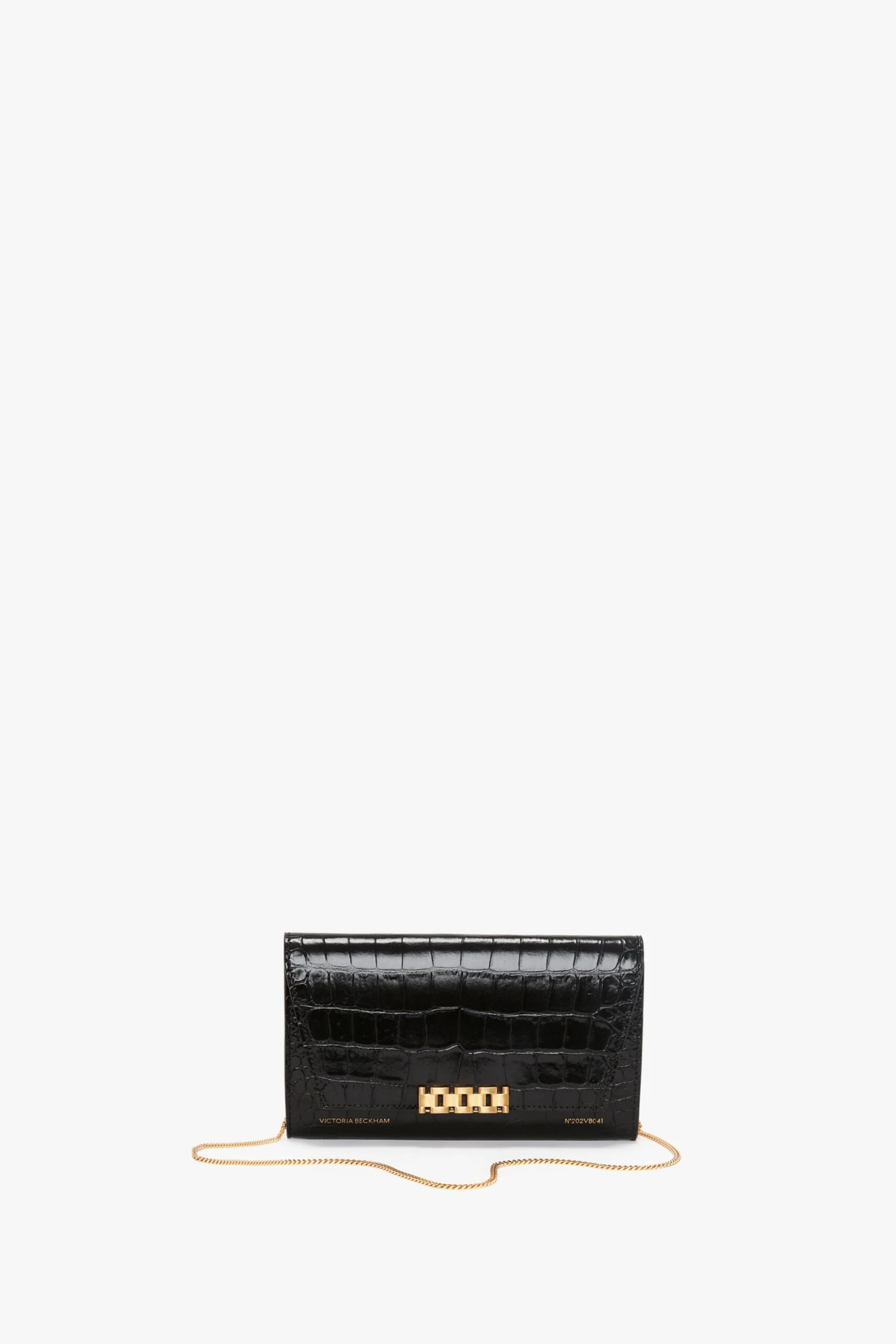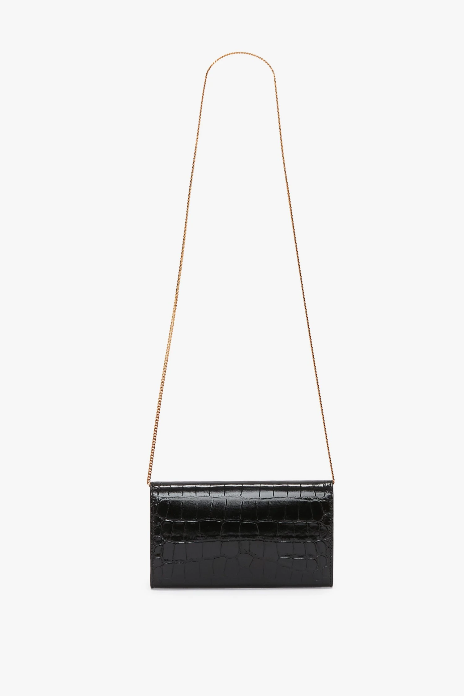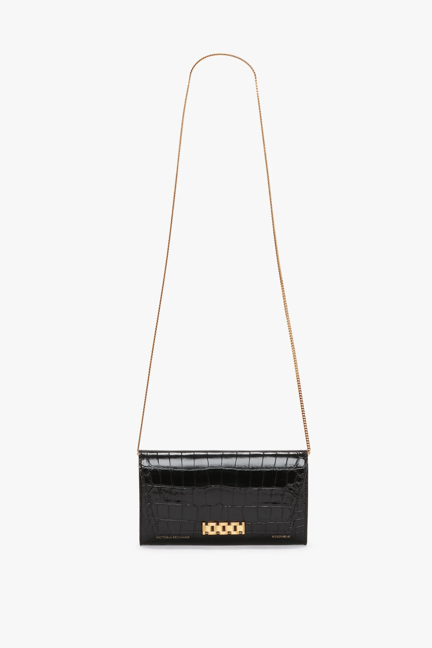 New to the Victoria Beckham leather goods edit, the Wallet on Chain bag is presented in a richly textured embossed croc leather for added drama. The golden chain strap is removable, allowing for versatile styling as a clutch or shoulder bag. It also features the brand’s iconic chain closure and is a practical and polished piece for day or night.