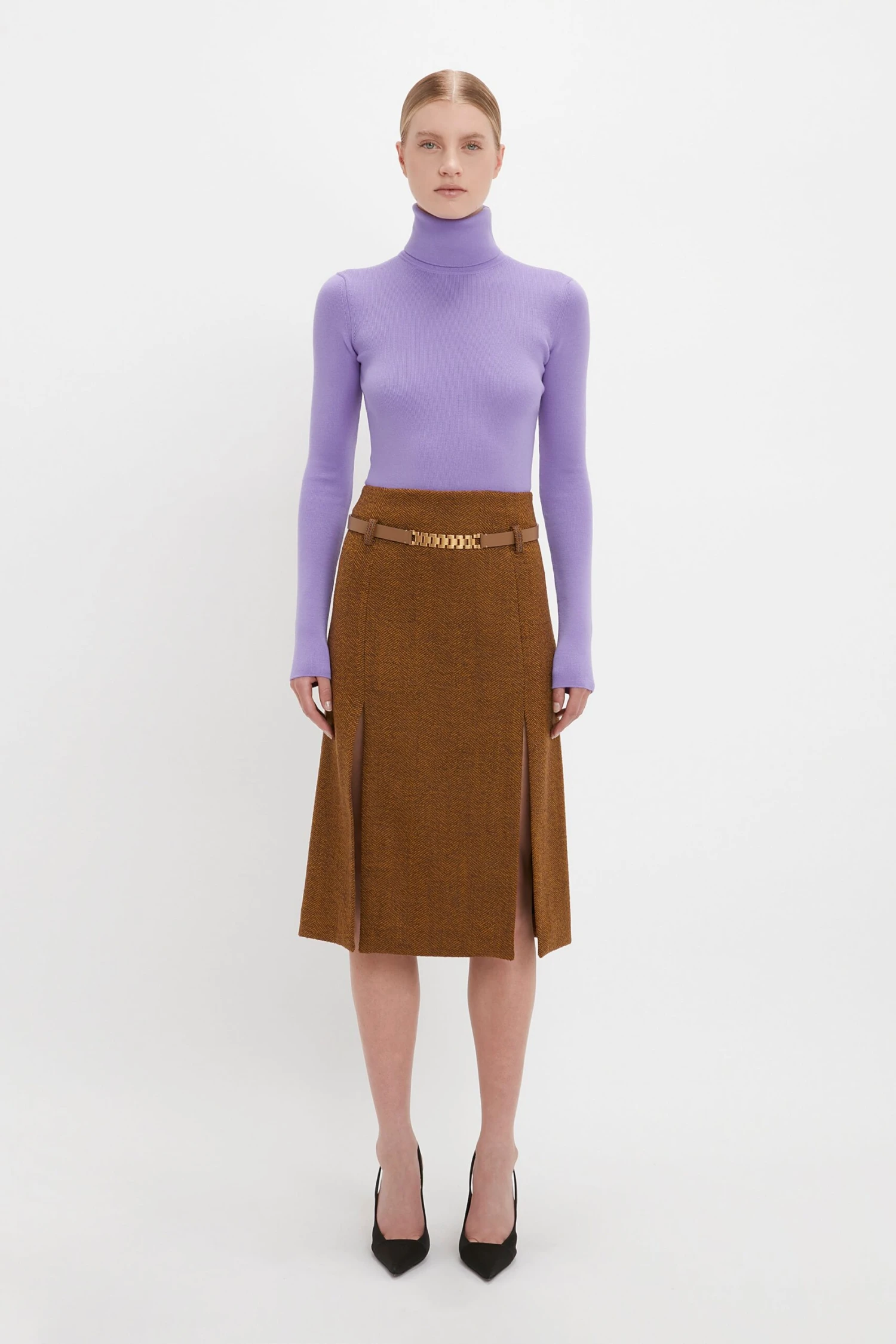 Styled with Knitted Polo Neck Jumper, Double Layer Split Skirt and Pointy Toe Pump